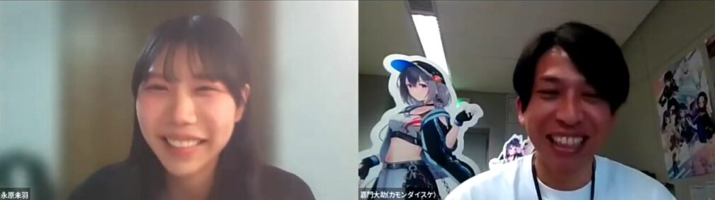 初めてのインタビューで本当に緊張していたんですが、途中から緊張もほぐれて楽しくお話をお聞きしていました。今回のお話を聞いて、VチューバーはTikTokとかYouTubeだけじゃなく、イベントのアナウンスとか色々なところで活躍されているっていうのをお伺いして、Vチューバーの可能性の広さにすごく驚きました。これから、Vチューバーの投稿とかが出てきたら、見てしまうだろうなと思いながらインタビューさせていただきました。すごく有意義な時間をありがとうございます!