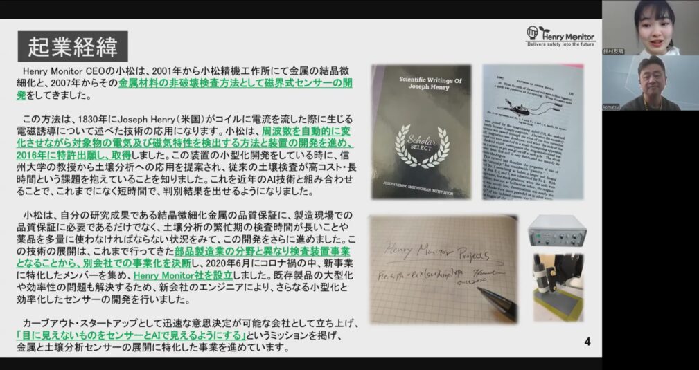 Henry Monitorという会社は、磁界を使ったセンサー技術を活用している会社です。磁界というのは磁石から出る磁束線のことで、例えばそばに金属が近づくと磁石がくっついたりしますよね。そういう信号を取って、土の状態や金属の状態を検査しています。