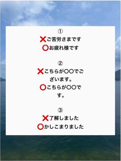 言葉の変化に対しても、何に対しても、時代の流れに身を任せてもいいですが、一度振り返ってみるのも良いのではないでしょうか。公的な場では、後悔先に立たずとなる前に、【単語編】、【会話編】の6つだけでも覚えてください!